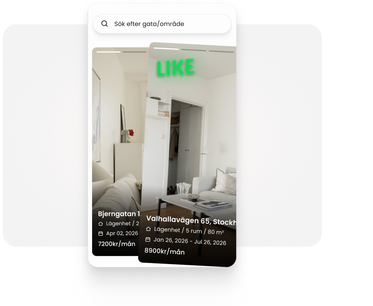 Utforska bostäder som matchar dina önskemål. Swipa vänster för att visa intresse eller höger för att se fler alternativ.